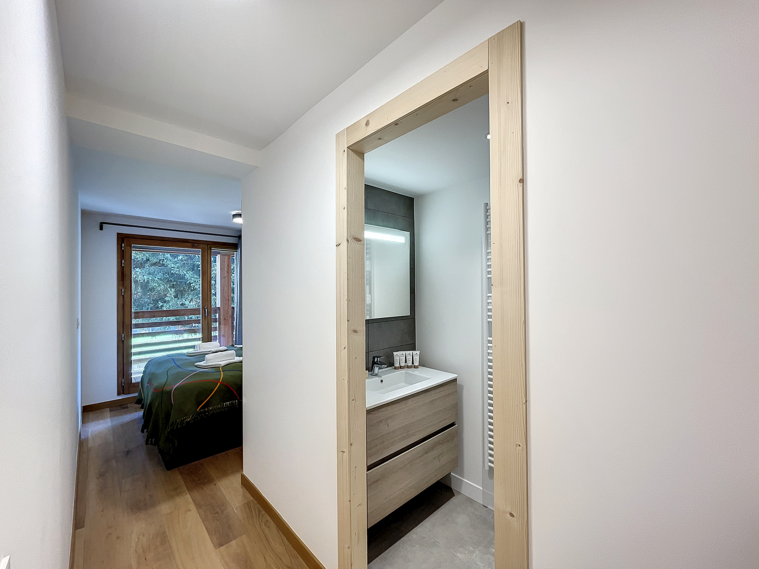 An elegant bedroom equipped with a double bed of 160, featuring access to the terrace and an adjoining shower room.