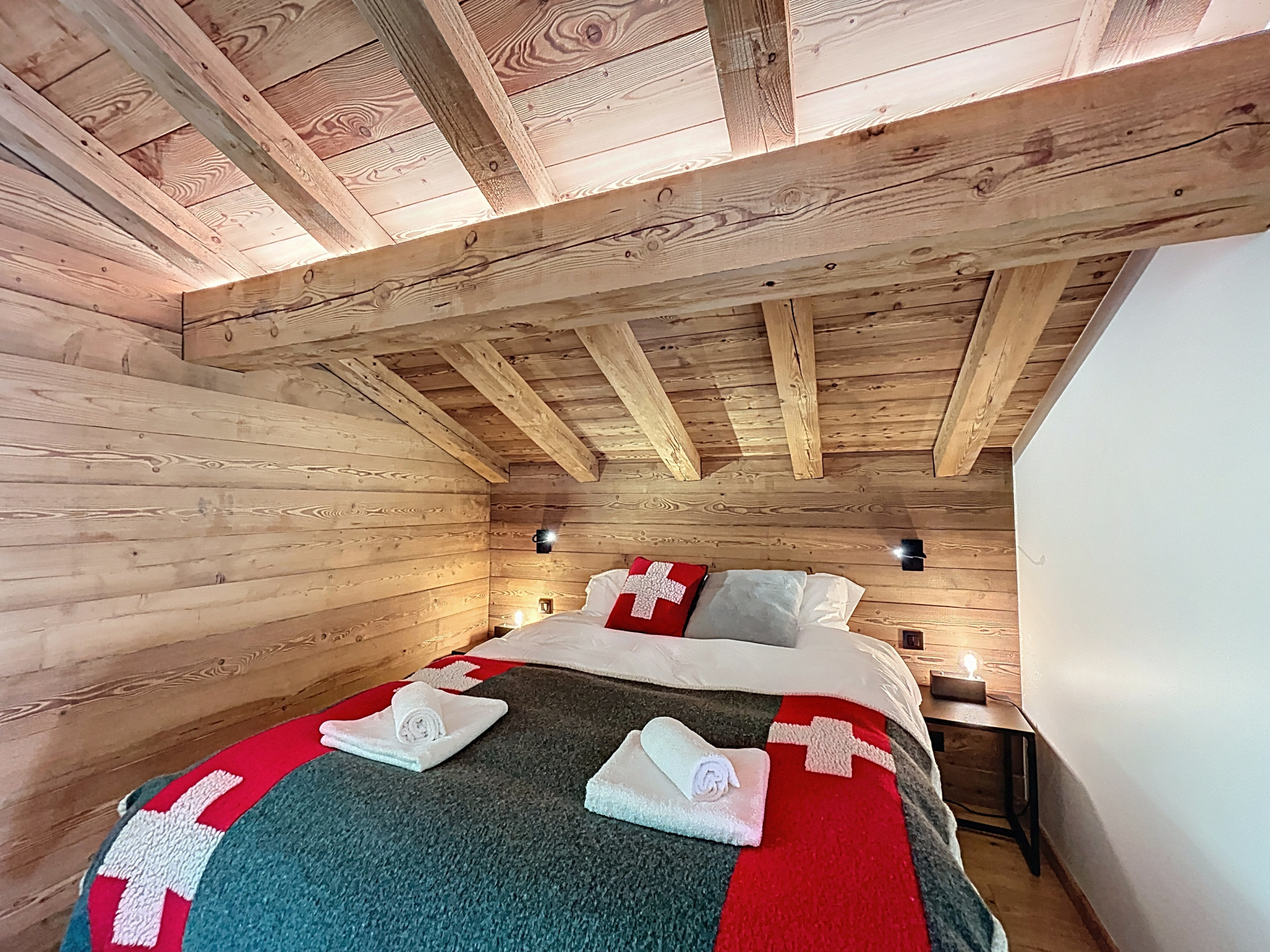 Capable of accommodating up to 10 people, the chalet has 4 bedrooms, including 3 double rooms (with beds that can be converted into single beds) and a custom-made dormitory with bunk beds equipped with reading lights and individual sockets, as well as an additional single bed. The 2 washrooms, the bathroom, and the 3 independent toilets spread across three levels ensure optimal comfort for family or friends' stays.