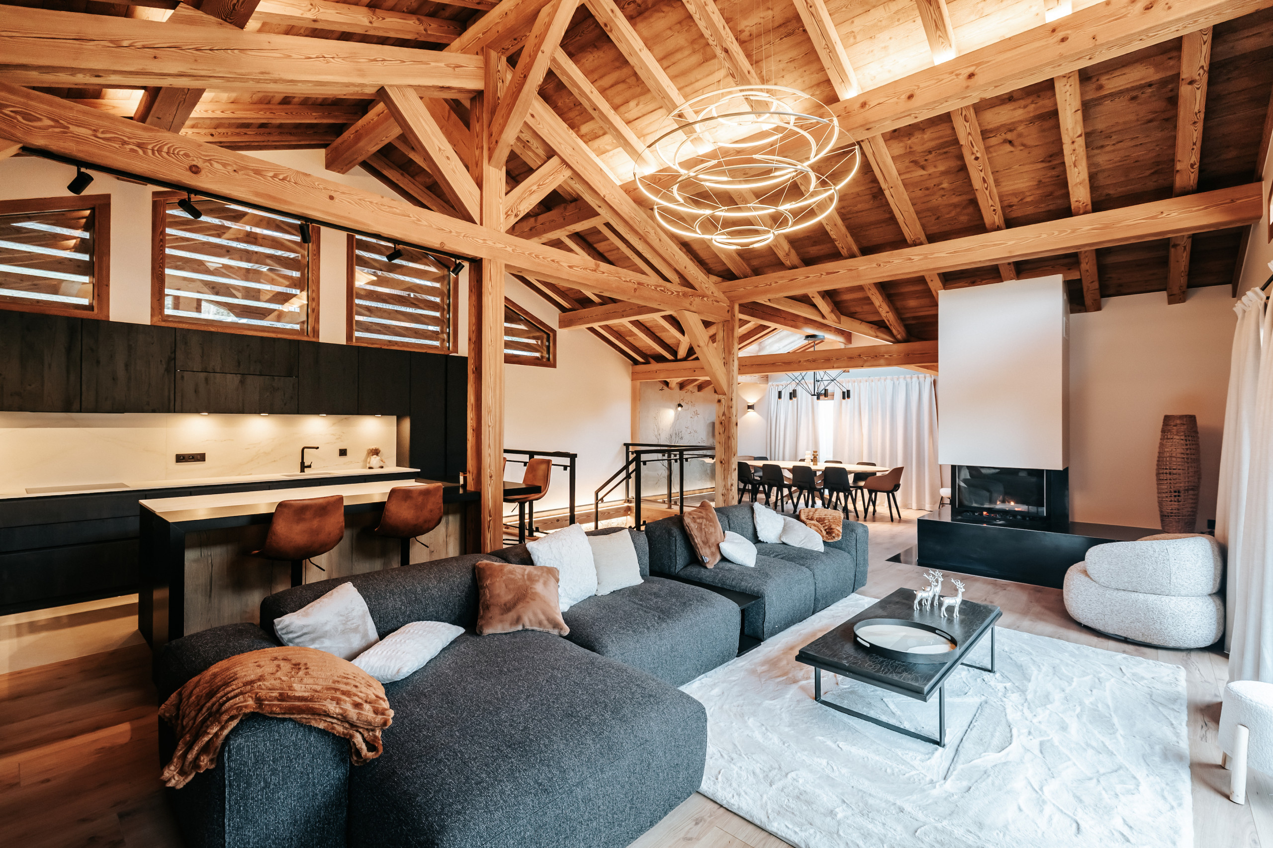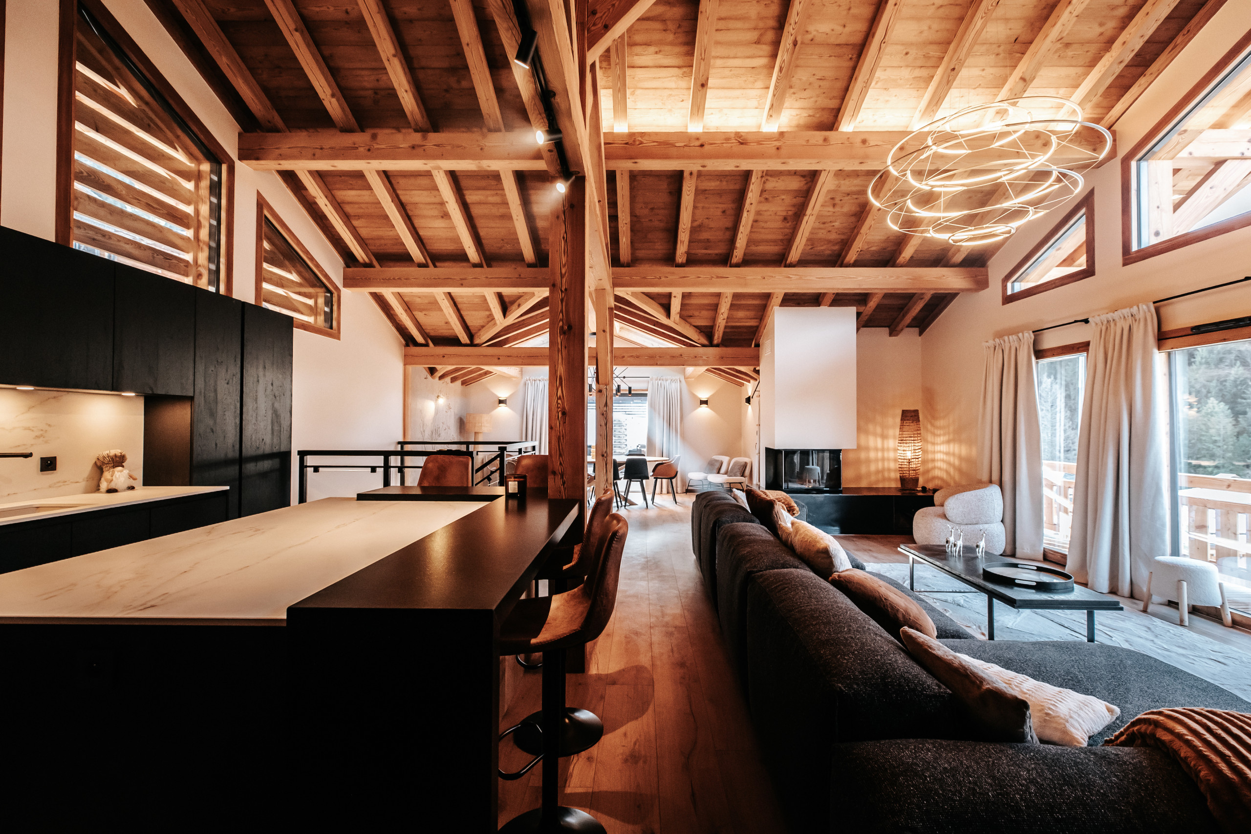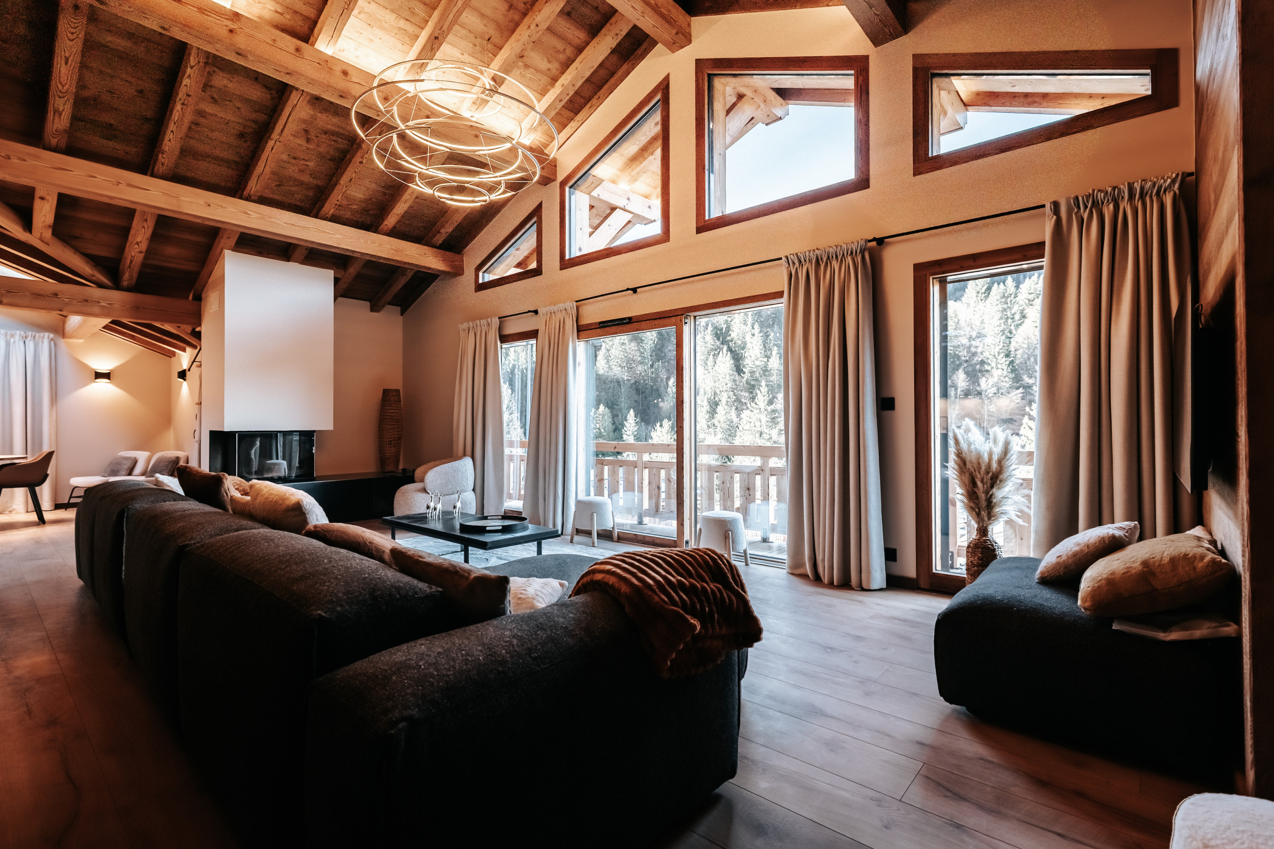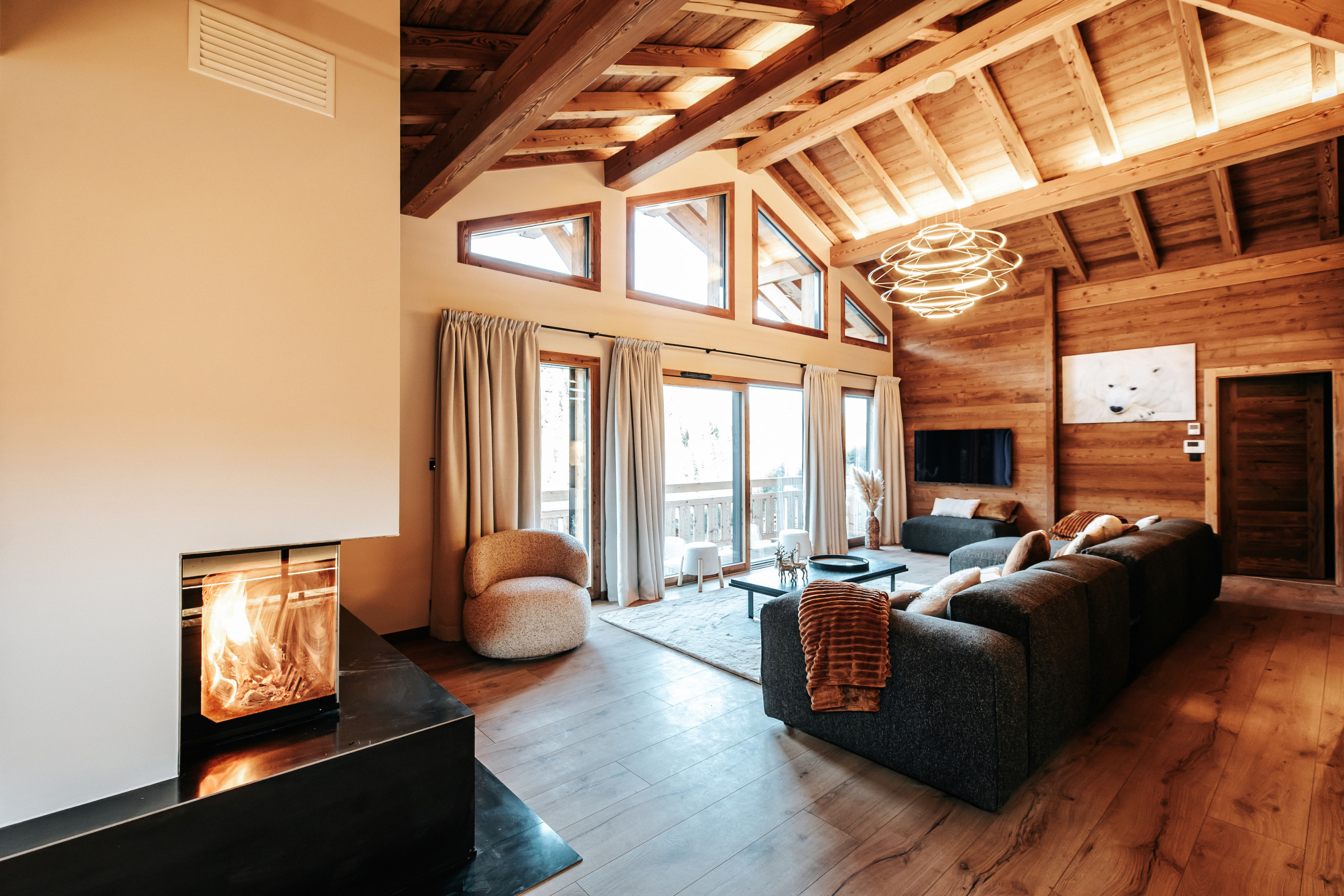 Le chalet peut accueillir jusqu’à 10 personnes grâce à ses cinq chambres en suite, dont quatre situées au premier étage et une au dernier niveau, à proximité des espaces de vie. Le dernier étage accueille une pièce de vie lumineuse réunissant salon, salle à manger et cuisine équipée. Le salon est doté d’une cheminée à insert, apportant une atmosphère chaleureuse après une journée en montagne, et s’ouvre sur une terrasse extérieure aménagée avec un jacuzzi professionnel à débordement et un sauna, pensés pour les moments de détente.