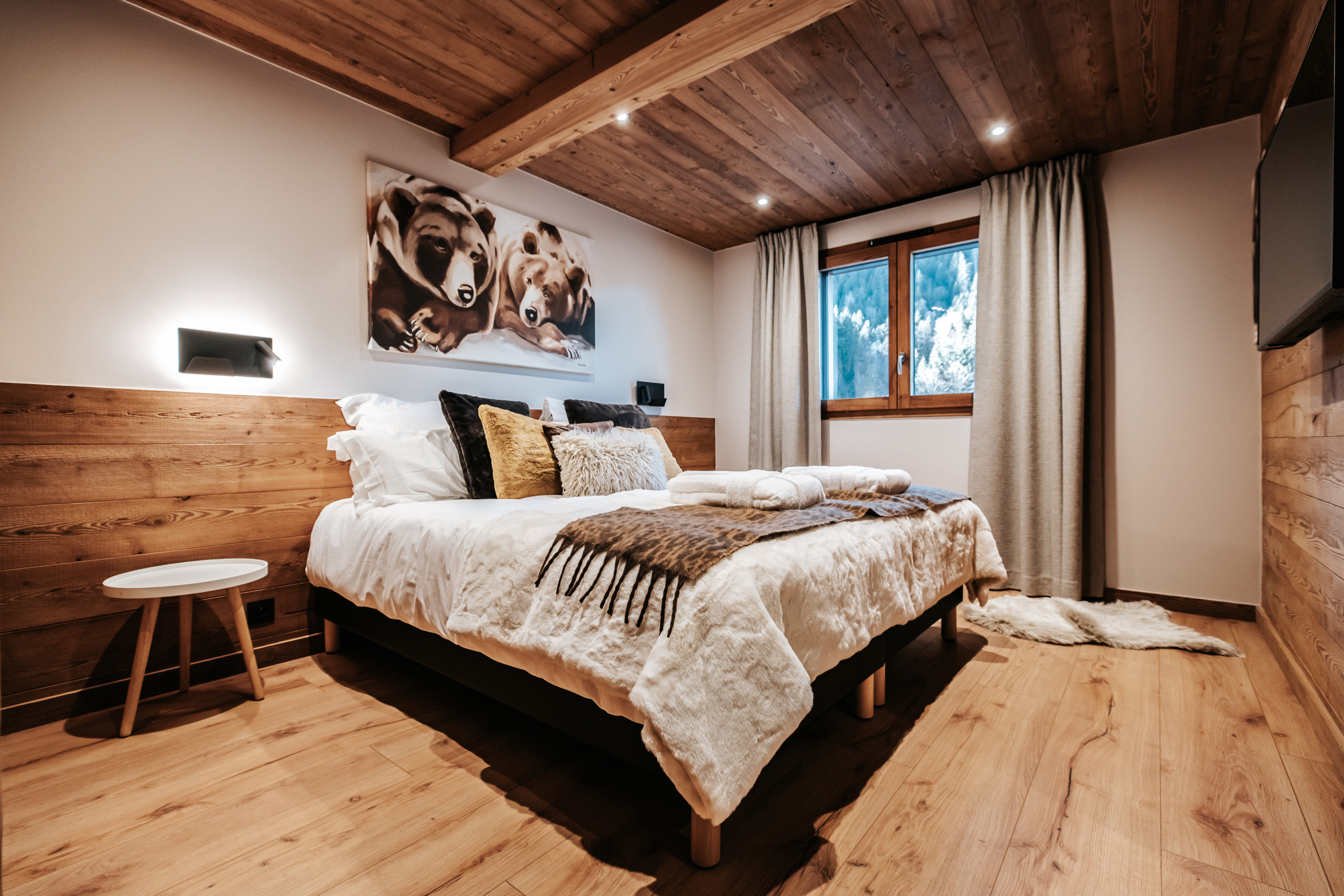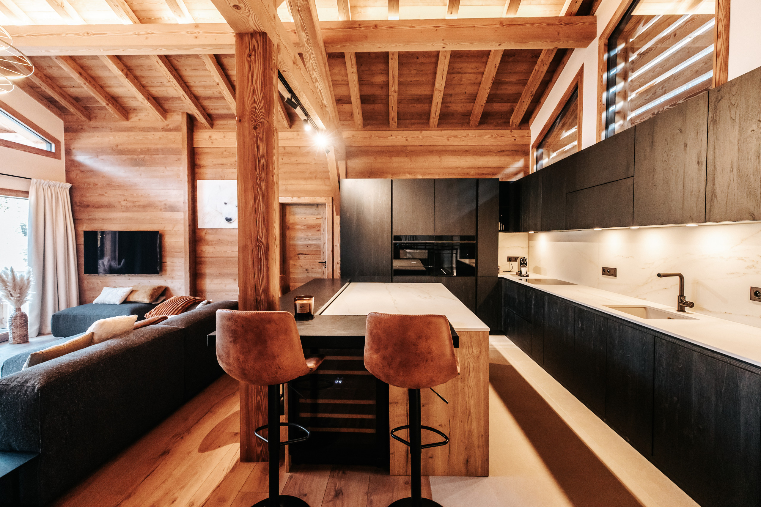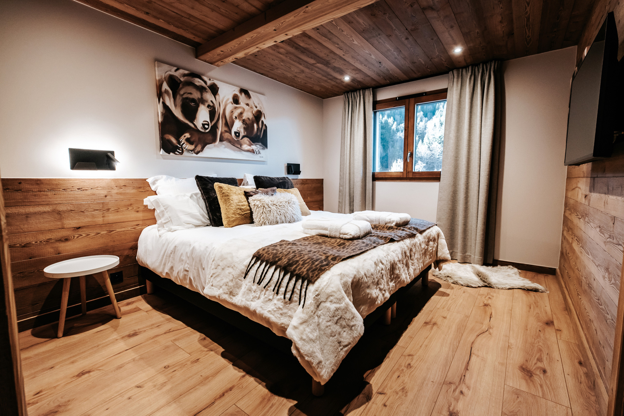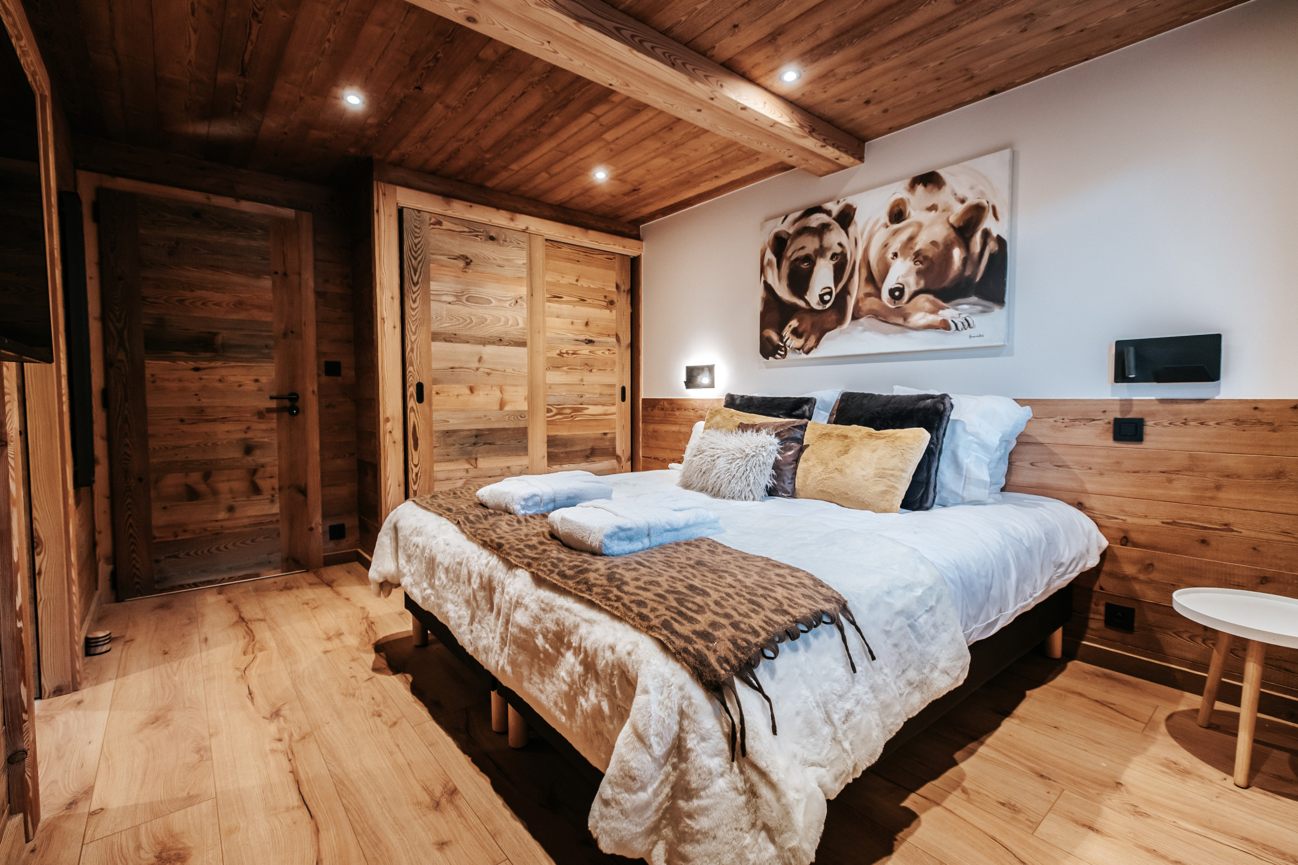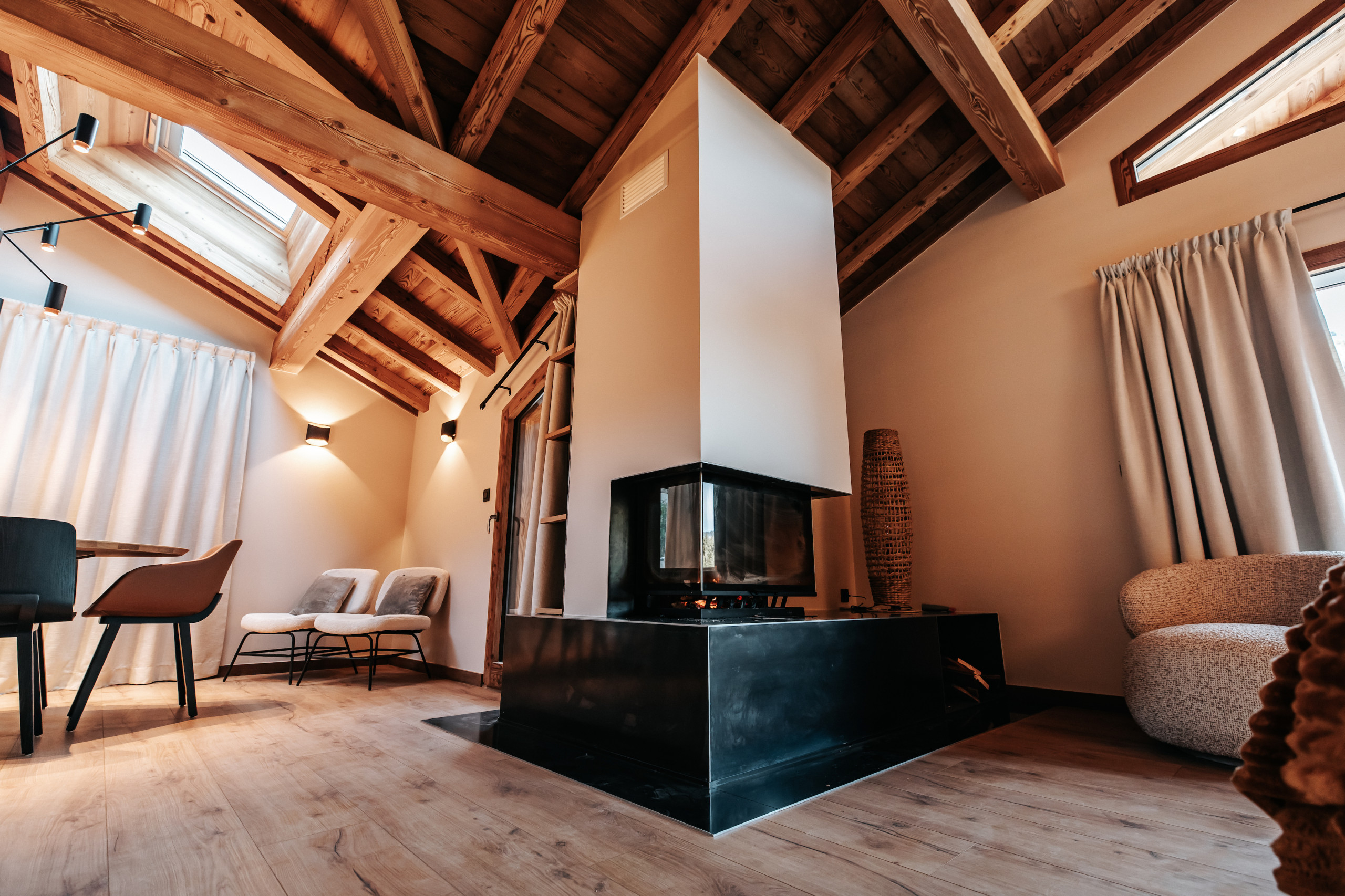 Le chalet peut accueillir jusqu’à 10 personnes grâce à ses cinq chambres en suite, dont quatre situées au premier étage et une au dernier niveau, à proximité des espaces de vie. Le dernier étage accueille une pièce de vie lumineuse réunissant salon, salle à manger et cuisine équipée. Le salon est doté d’une cheminée à insert, apportant une atmosphère chaleureuse après une journée en montagne, et s’ouvre sur une terrasse extérieure aménagée avec un jacuzzi professionnel à débordement et un sauna, pensés pour les moments de détente.