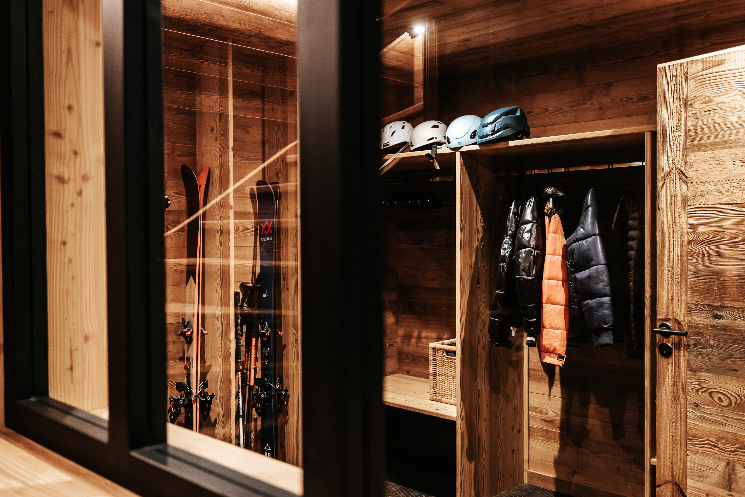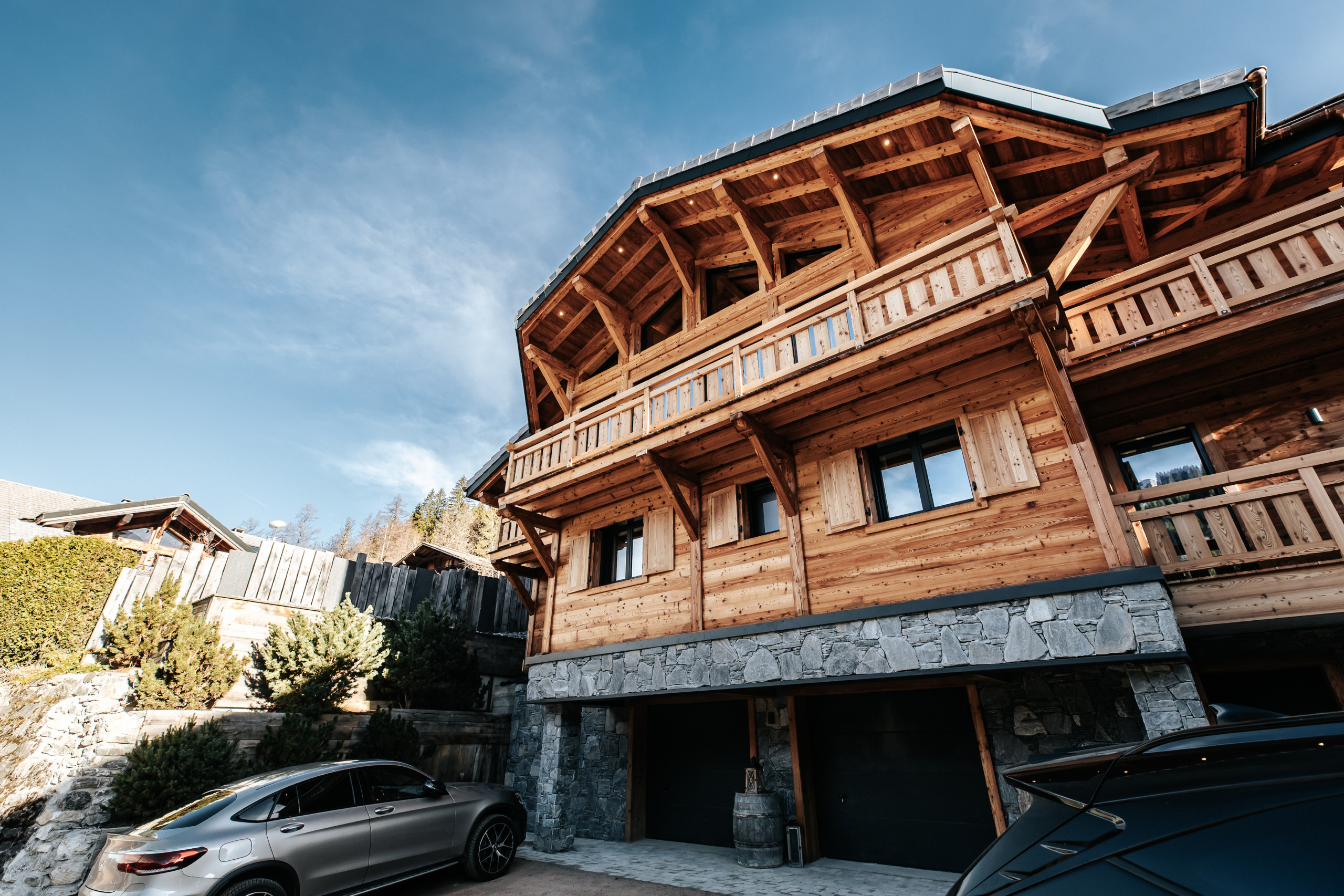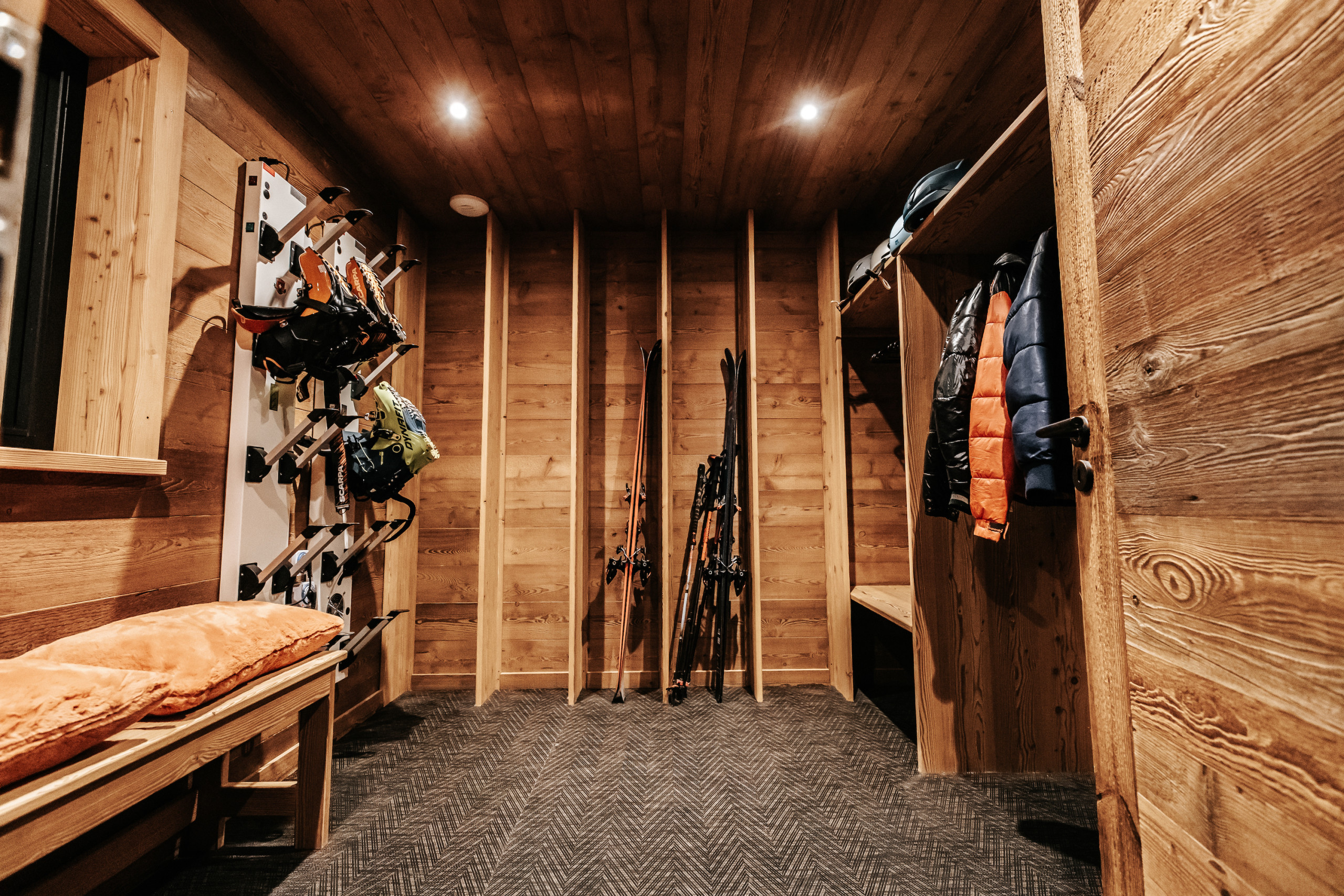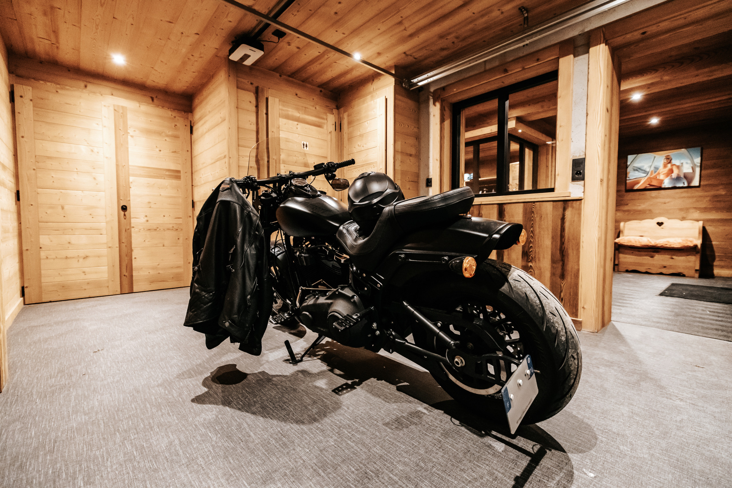 Dès l’entrée, le chalet dispose d’un casier à skis avec sèche-chaussures, facilitant le retour des pistes. Un garage fermé pour une voiture, complété par un garage couvert permettant d’accueillir jusqu’à trois motos, vient parfaire les prestations pratiques du bien.
