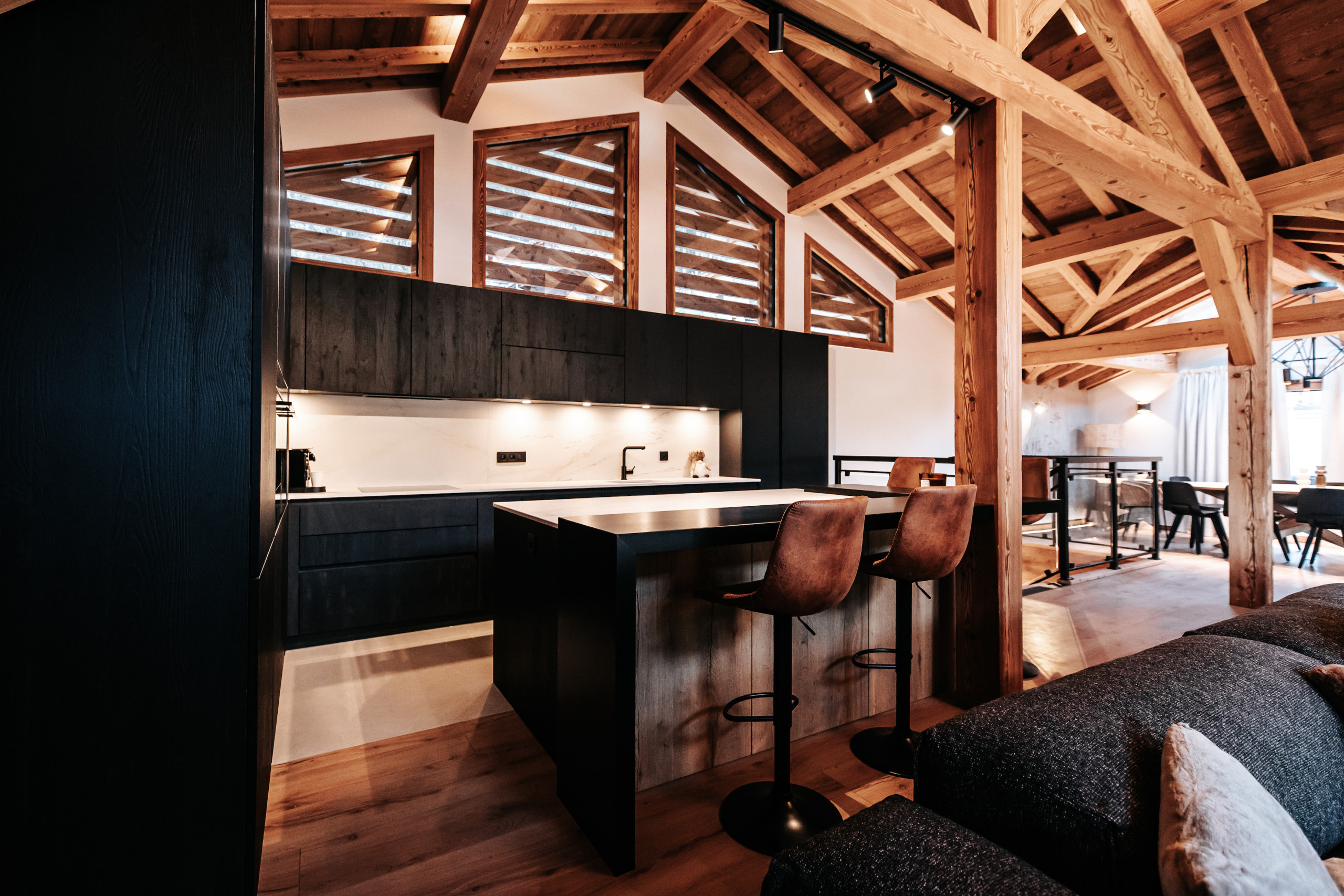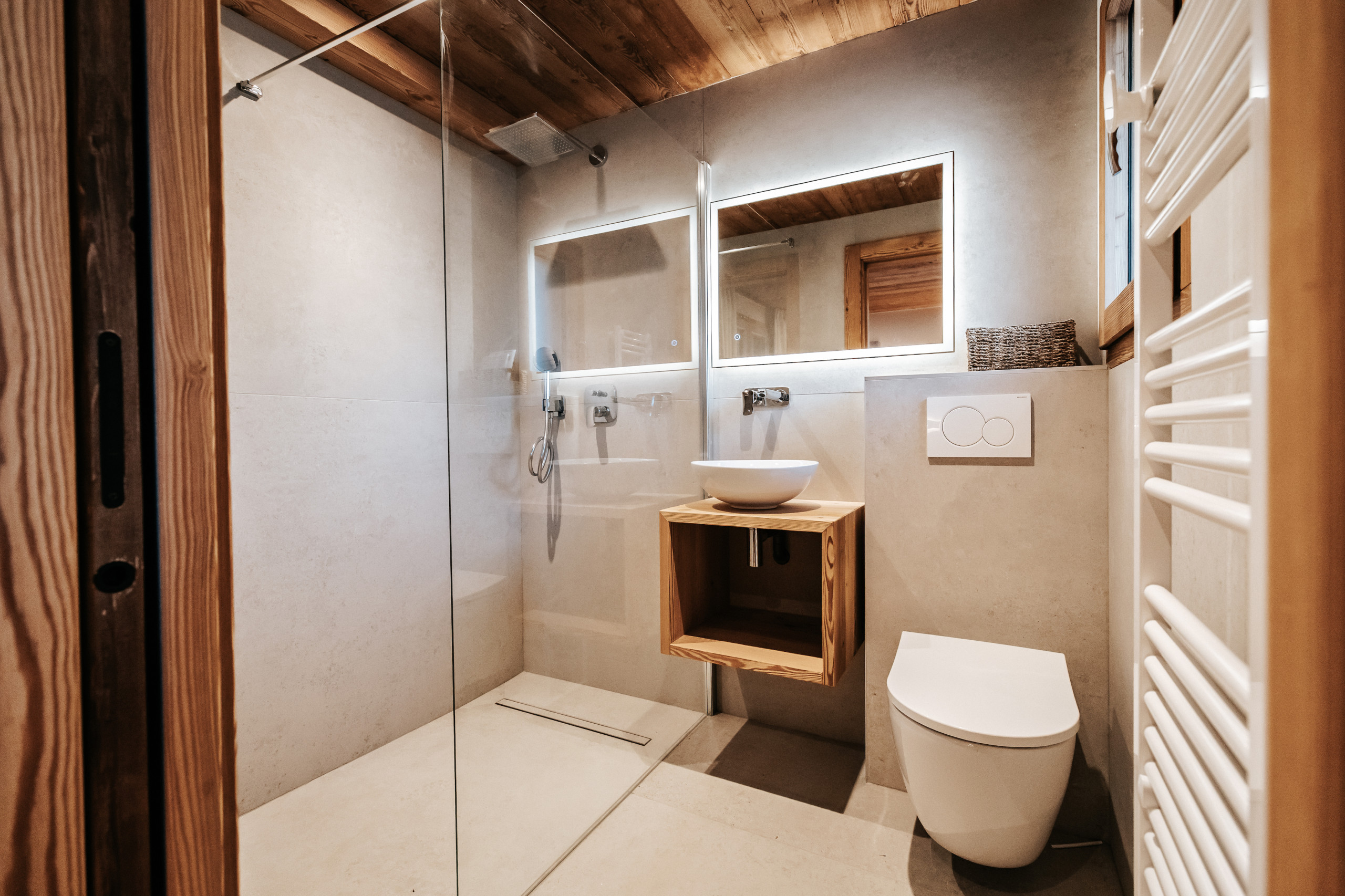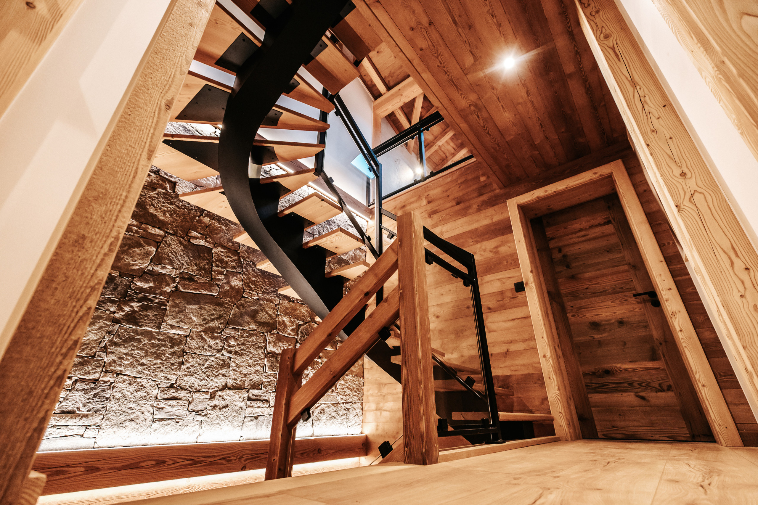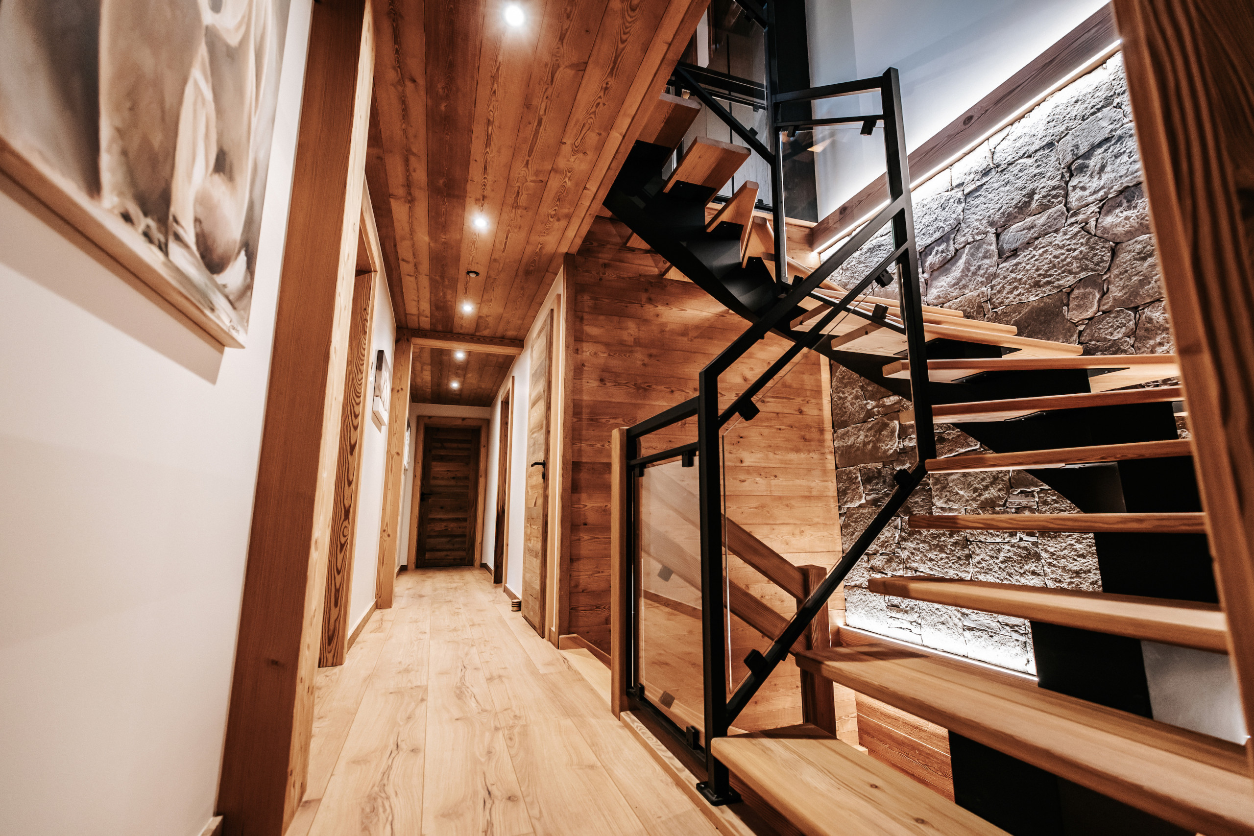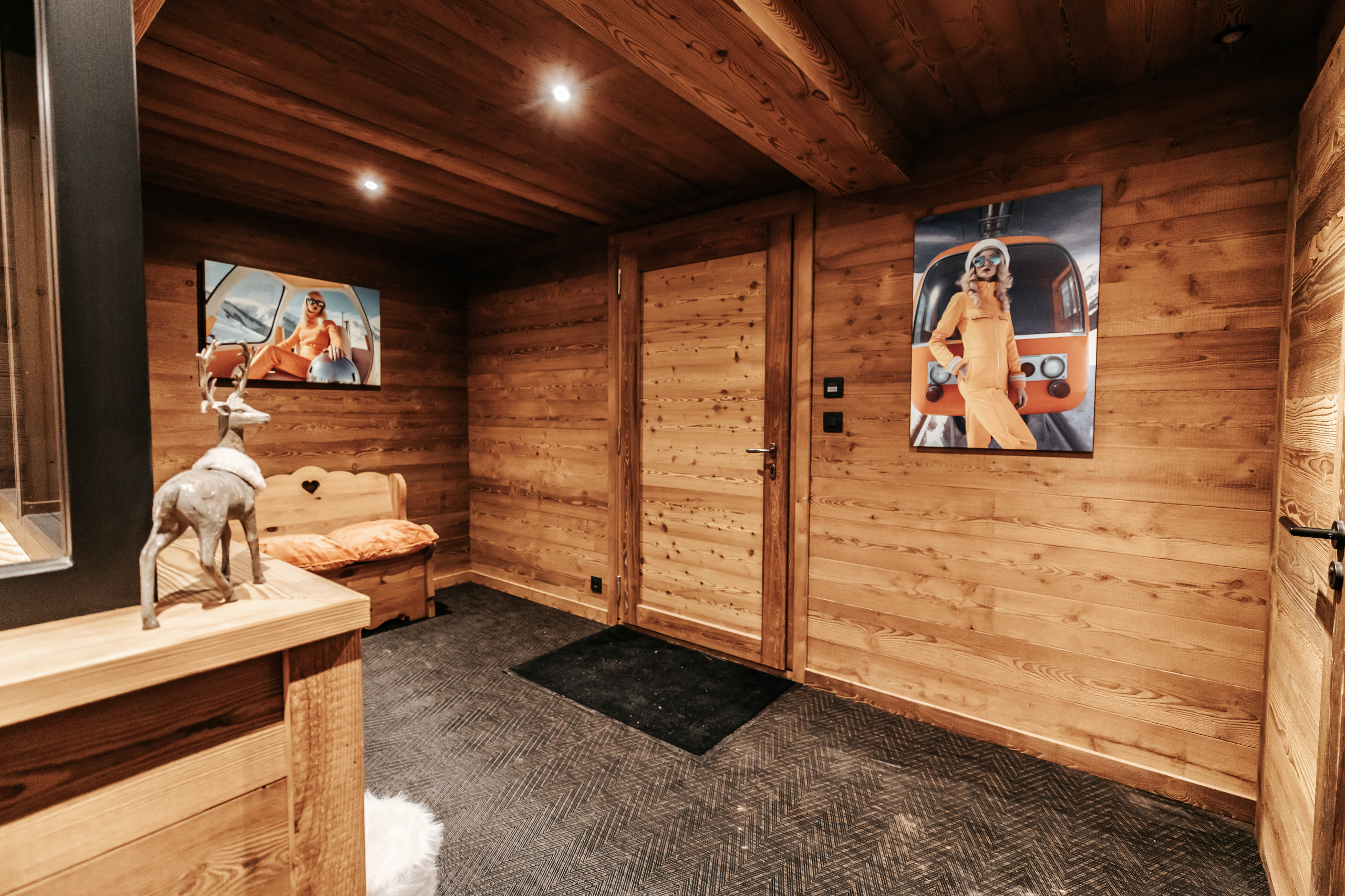Dès l’entrée, le chalet dispose d’un casier à skis avec sèche-chaussures, facilitant le retour des pistes. Un garage fermé pour une voiture, complété par un garage couvert permettant d’accueillir jusqu’à trois motos, vient parfaire les prestations pratiques du bien.